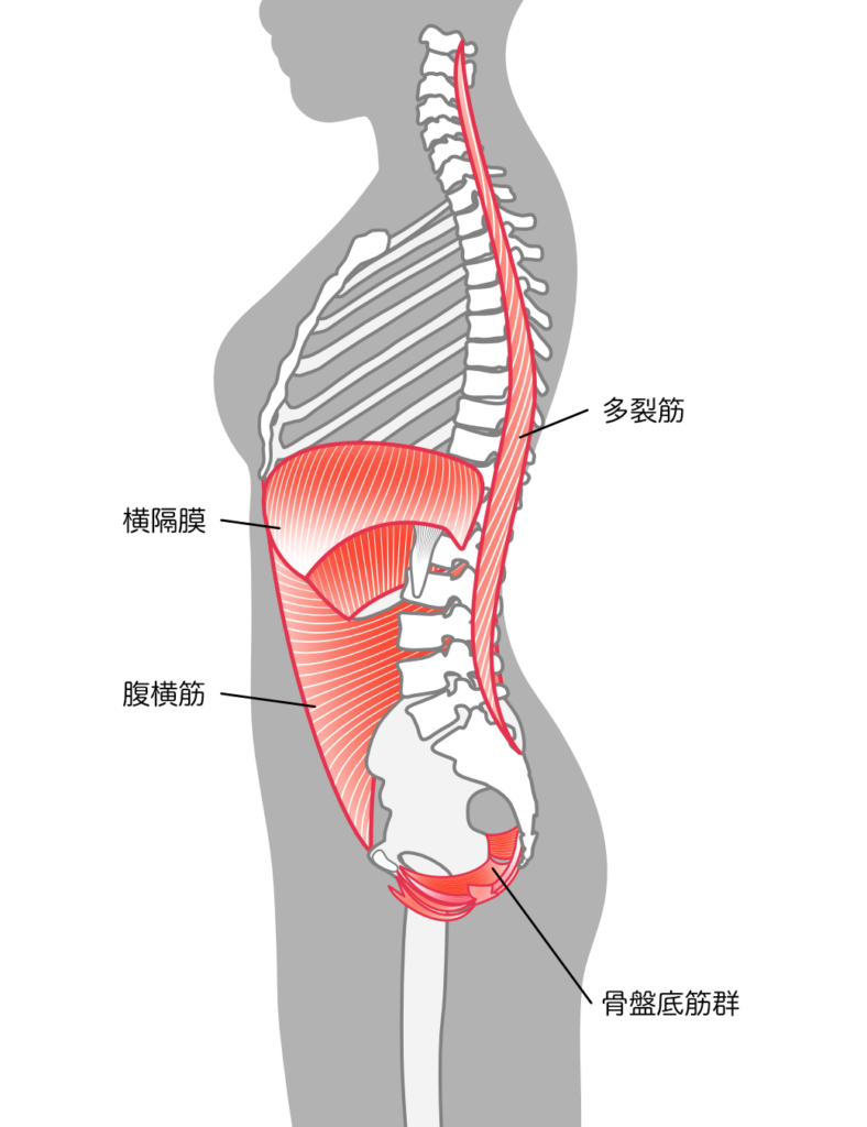 腹横筋(ふくおうきん):腹部の最深部にあり、"コルセット"のように背骨と内臓を安定化。腹圧を高め、姿勢維持に貢献。