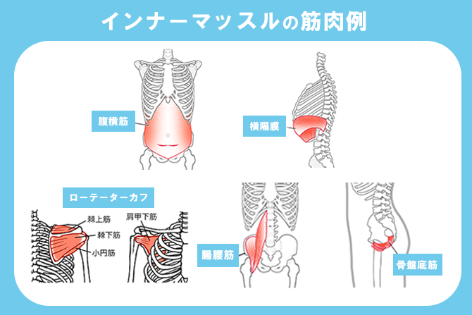 アウターマッスル(表層筋)は大きな力を発揮する筋肉で、動作の主役。一方、インナーは"体を支える裏方"として、安定性と機能性を支えます。